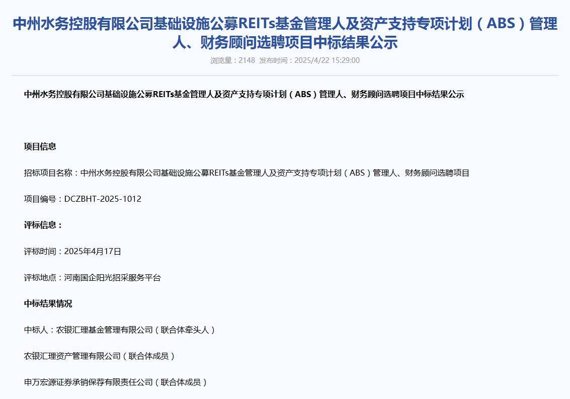 4月22日,中州水务控股有限公司发布了基础设施公募REITs基金管理人及资产支持专项计划(ABS)管理人、财务顾问选聘项目的招标结果公告,农银汇理基金管理有限公司、农银汇理资产管理有限公司、申万宏源证券承销保荐有限责任公司组成的联合体中标。