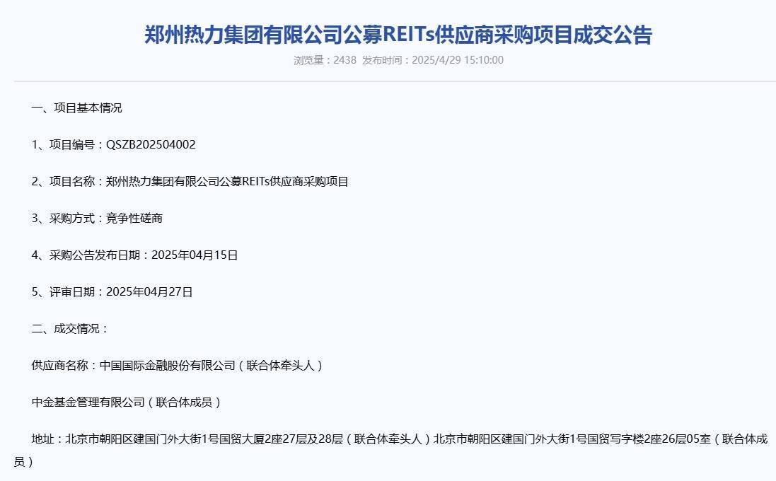 4月29日,郑州热力集团有限公司发布了公募REITs供应商采购项目成交公告,中国国际金融股份有限公司、中金基金管理有限公司组成的联合体中标。