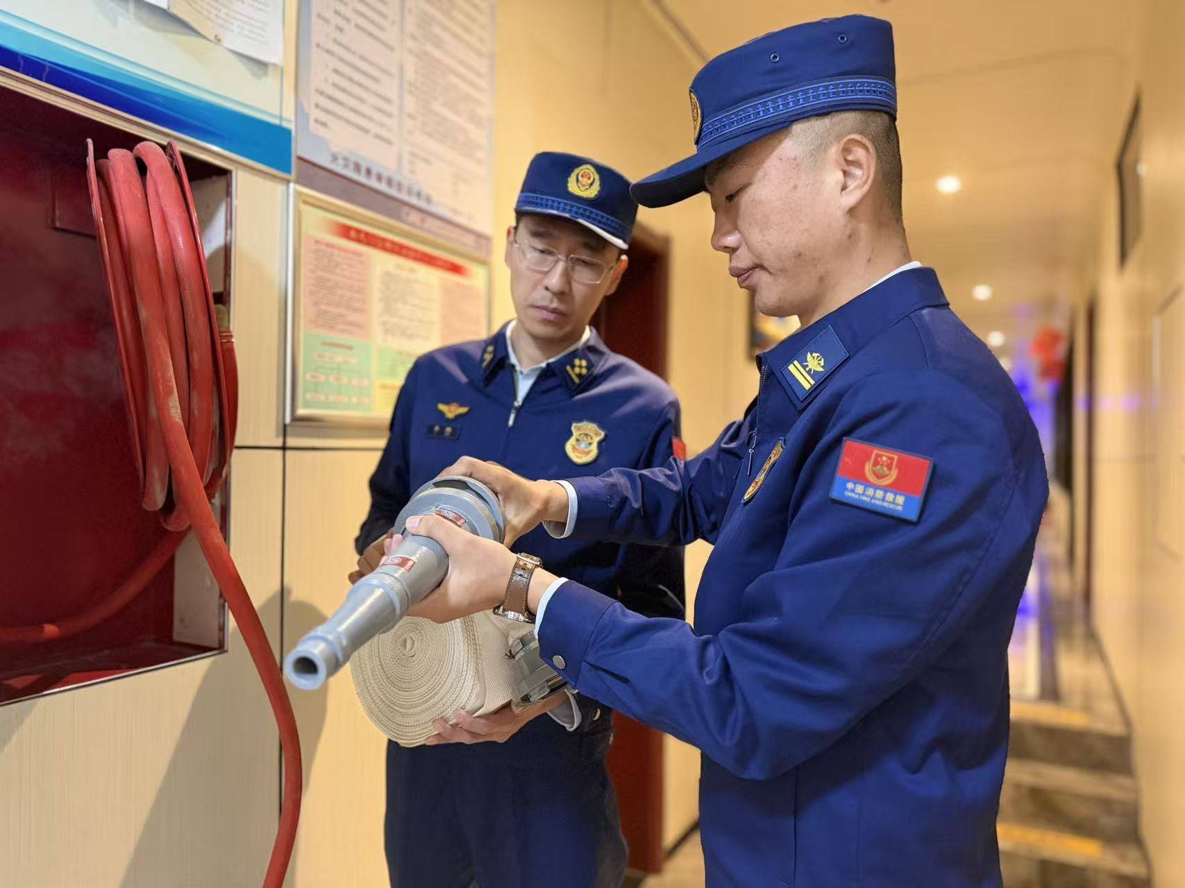 消防指战员在检查岱顶消防安全重点单位室内消火栓完好程度。新华社记者 张钟仁 摄“每年新队员入站,必修课便是‘走一趟盘道、看一棵青松、访一位挑山工、学一遍站史’,激励队员们继续弘扬纪律严明、永不退缩、冲锋在前、不怕牺牲的战斗精神。”李鹏说。